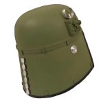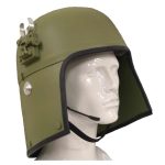 Beautifully handmade in olive green plastic with chin strap and mic tip.